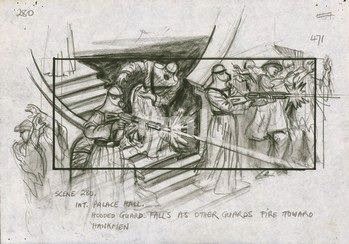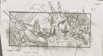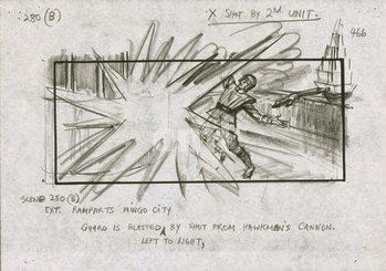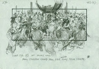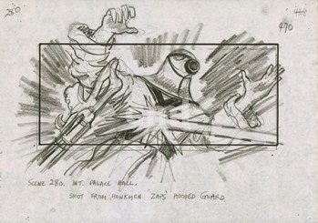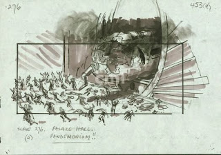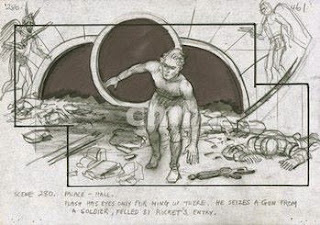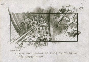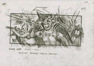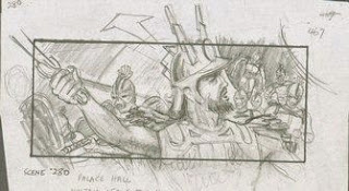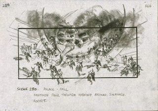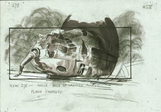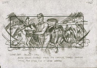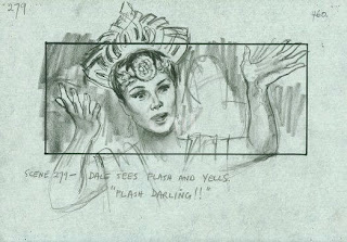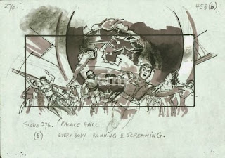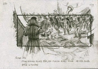 FLASH GORDON storyboards - there was question as to who the artist was on the Flash Gordon Storyboards. Dino had given these to me years and years ago, saying, in that off-hand way he has, "Here, take these, you like them, these are from Mentor," so I always assumed they were his. Someone here pointed out the boards I was uploading may not be done by Mentor, and provided a link to a Flash Gordon site and Mentor's site indicating which work he did on Flash Gordon. I wondered if Dino was wrong, and let it go... Then I found 4 more boards -- the originals of these are very large, and in the bottom corner they have Mentor's signature. These are first generation production copies -- which means in the process of copying, their lines have been altered. Reduced, the charcoal marks become even thicker and rougher, but in their original scale, the work looks different. The first 2 of are one board, but was too large to fit on the scanner so are two jpgs. The 3rd is his signature and the 4 is a fax copy which was sent from the set to the office, reduced down to an 8x11.